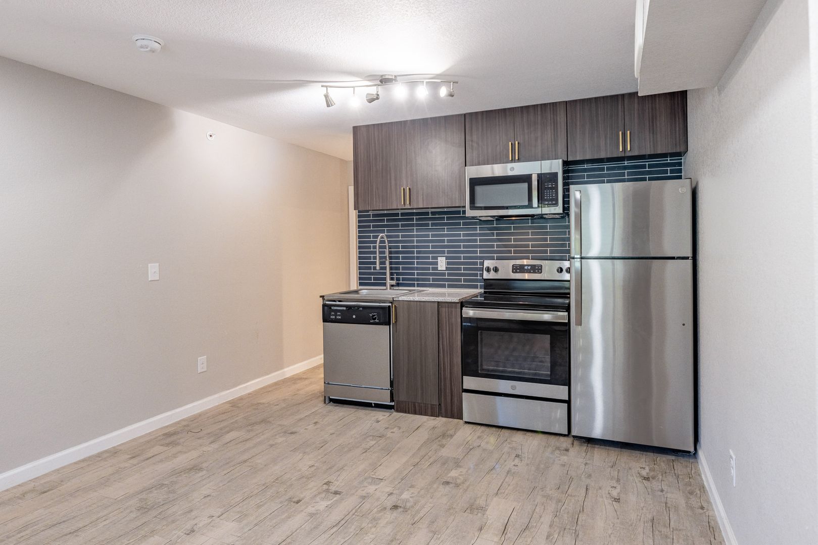 New stainless steel appliances — microwave, dishwasher, refrigerator & stove