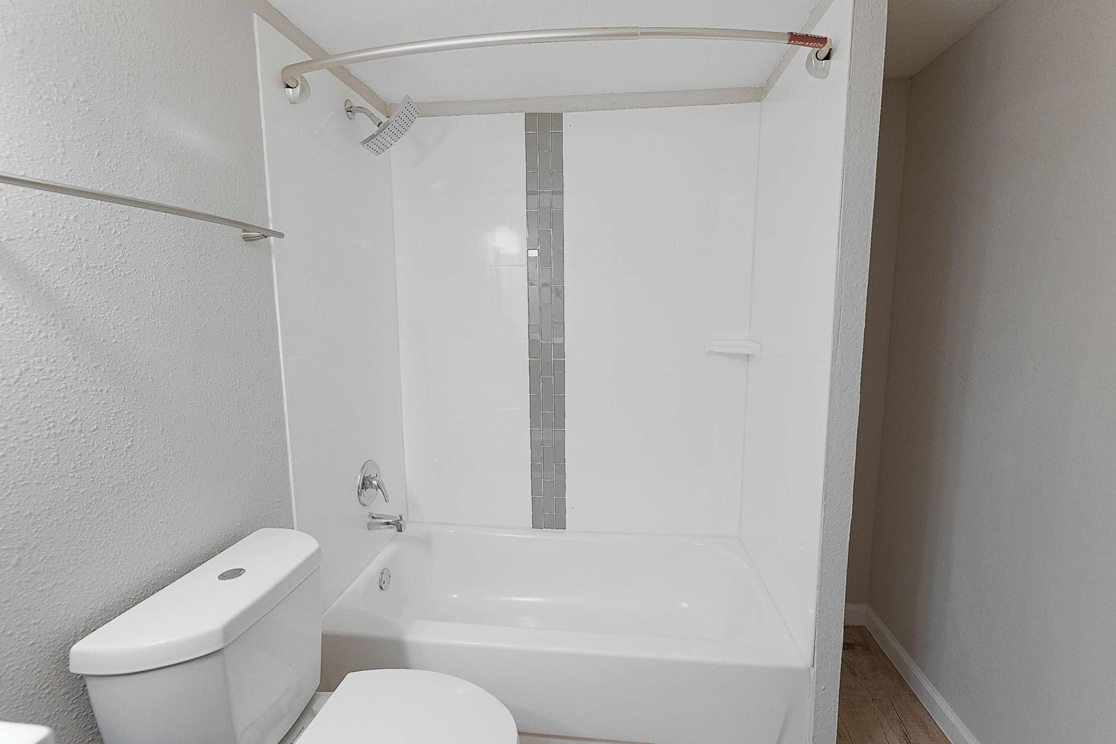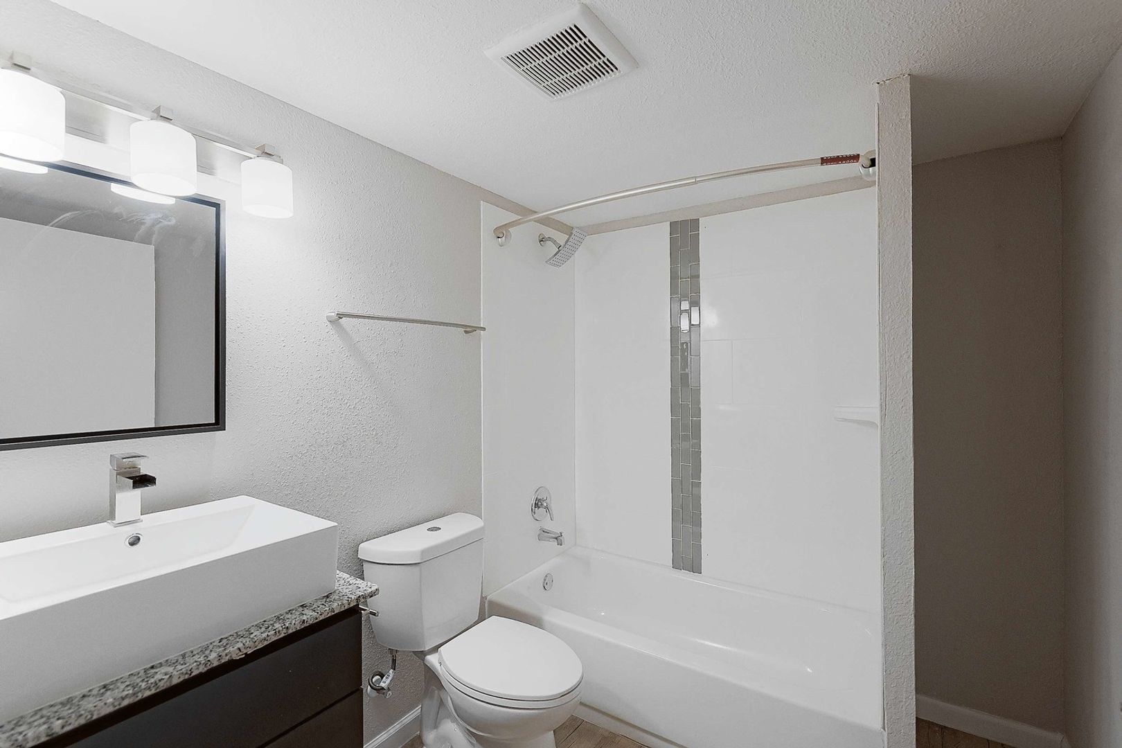 Updated bathroom with tiled tub surround and new vanity