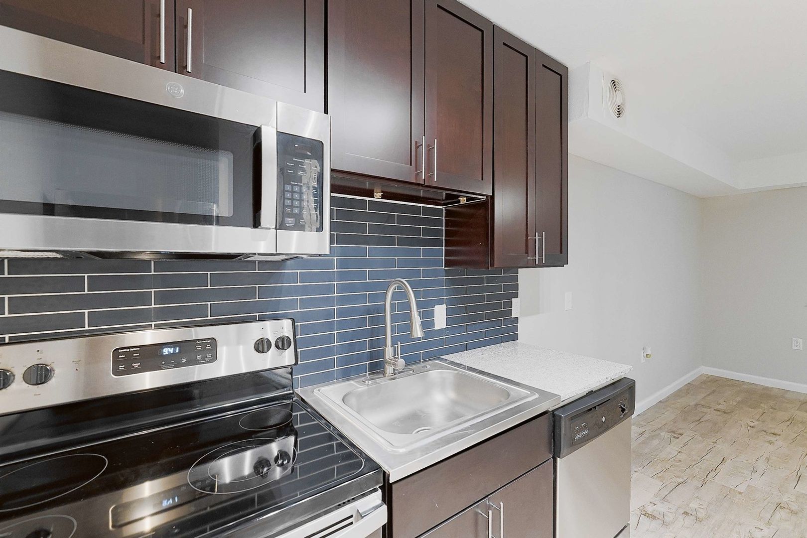 Stainless steel appliances including refrigerator, stove, dishwasher, and microwave