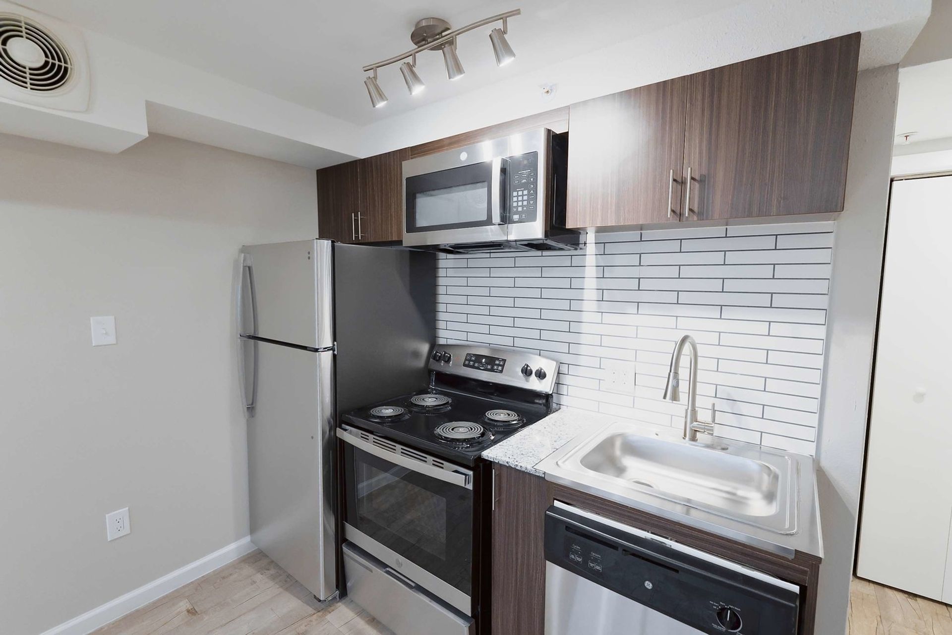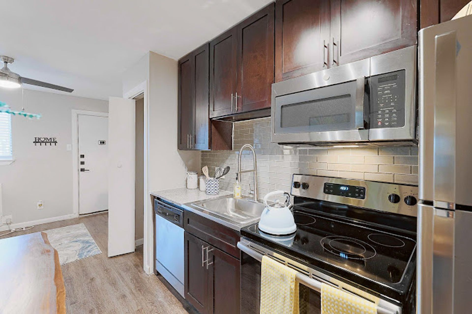 Stainless steel appliances — dishwasher, refrigerator, stove, and microwave