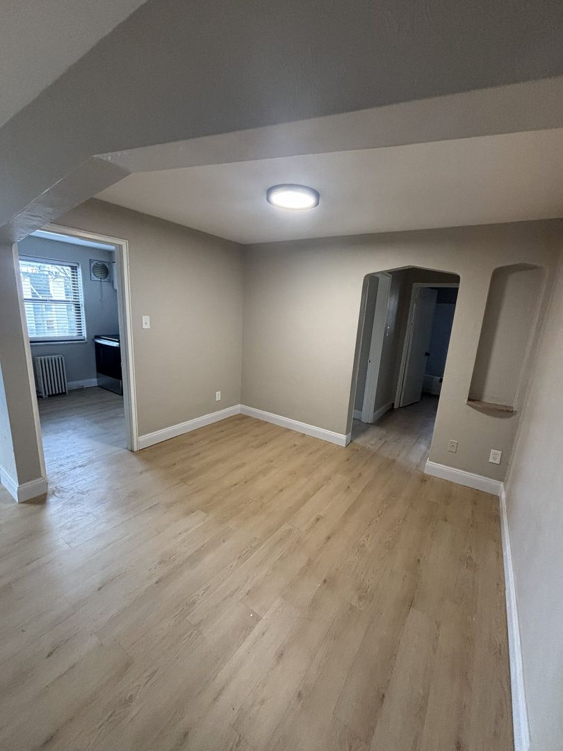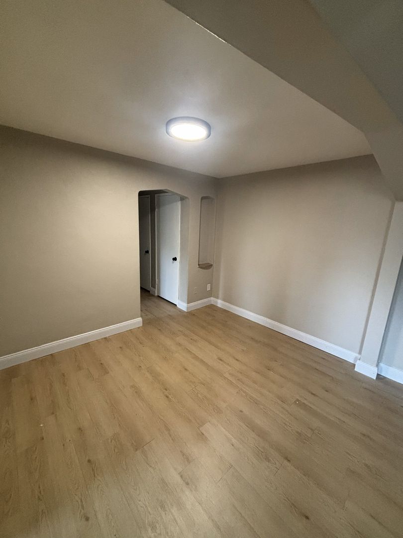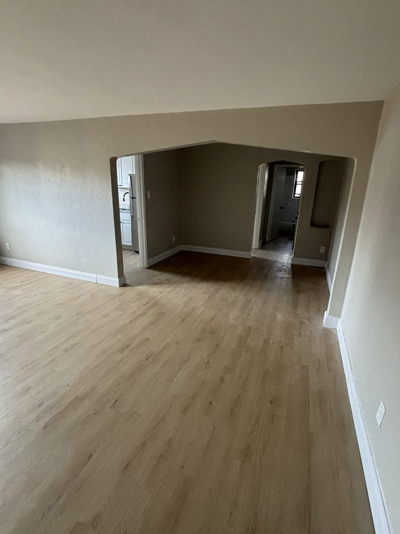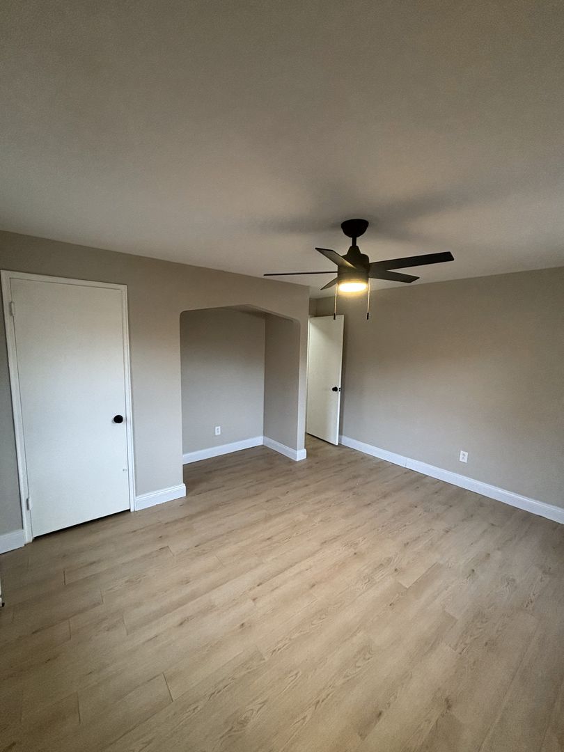 Spacious layout with an open living room/dining room and a large bedroom with a charming arched nook.