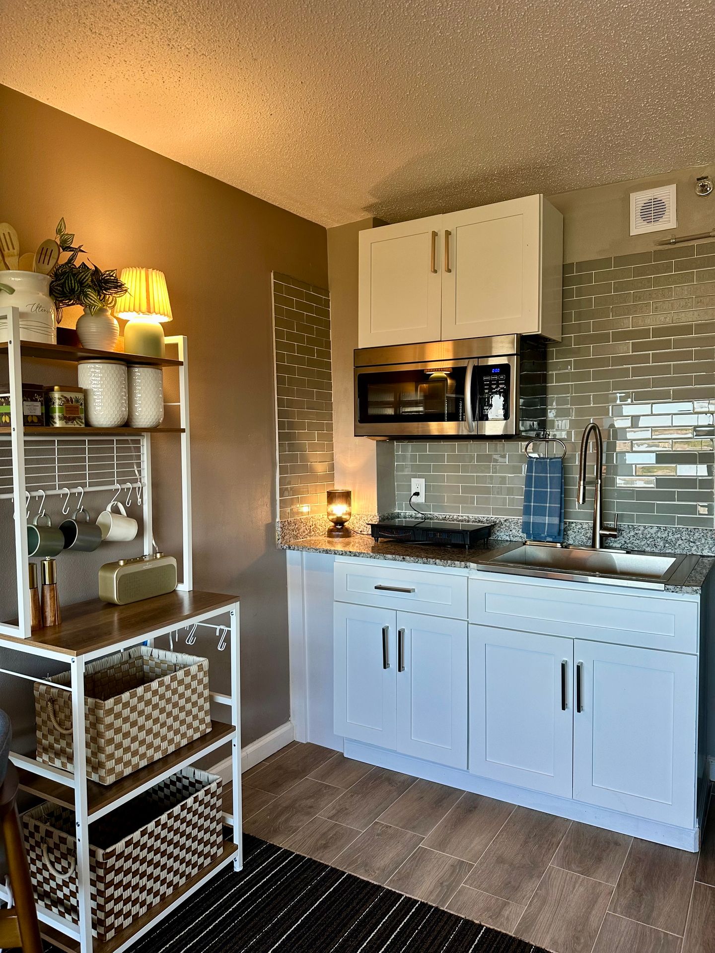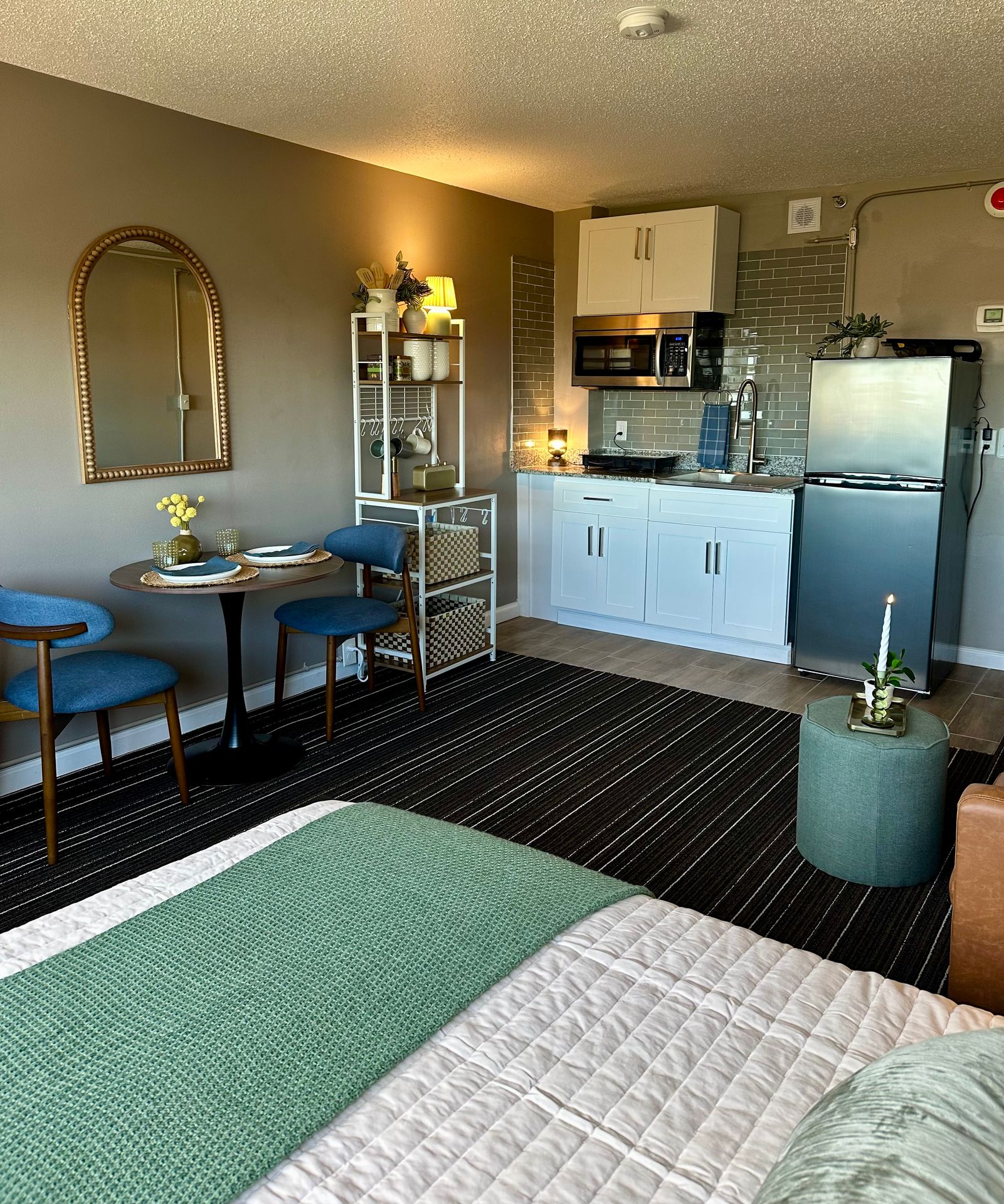 Stainless steel appliances, including refrigerator, microwave, and stove